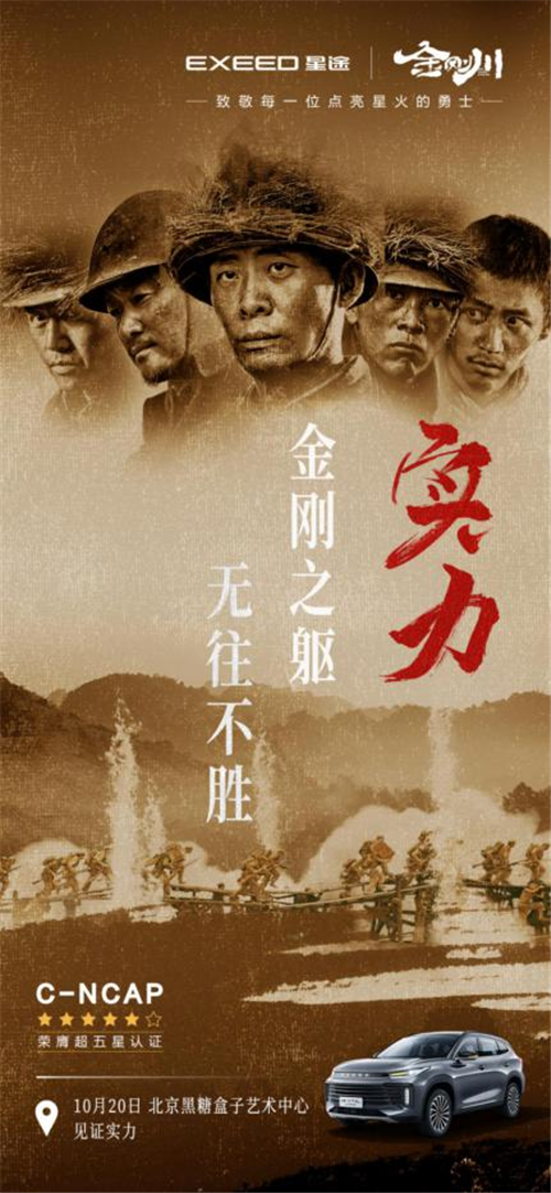 无论世界时局如何变幻,中国品牌将披荆斩棘、一往无前。EXEED星途将以怎样的勇气、坚守与实力,谱写中国力量不断向上的英雄篇章,10月20日19:30,北京黑糖盒子艺术中心,热血即将启幕。届时《金刚川》电影主创团队及神秘军事大咖将共同亮相发布会现场,让我们共同期待!