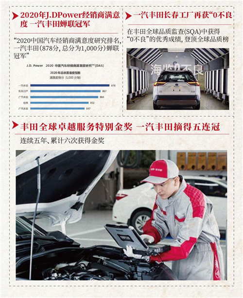 一汽丰田向来注重与用户联系最紧密的最后一环——经销商,在今年国际权威调查机构J.D. Power发布的一份报告《2020年中国汽车经销商满意度研究(DAS)报告》中显示,一汽丰田以878的成绩位列第一名,这也是一汽丰田连续第二年在该项调查中获得第一名,书写了“蝉联”。一汽丰田在前行的路上,不断强化自己的销售体系,带个用户超越同级的愉悦购车、用车体现,但同样没有忘掉“客户第一”的经营初心。