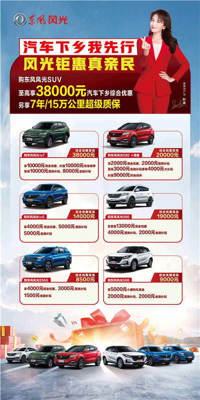 除2款新车型外,全域中型SUV风光ix7、智能轿跑新SUV风光ix5、年轻人的SUV风光S560、超级都市SUV风光580等现有SUV车型也纷纷参与此次汽车下乡综合优惠活动,为不同需求的用户提供了更多选择。
