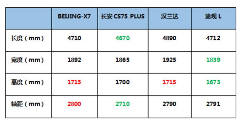 空说数据参数或许让消费者对这一空间大小没什么概念,以同为紧凑型SUV的热销车型-哈弗H6和长安CS75 PLUS为例,两款车的车身长度不足4700mm,轴距刚超过2700mm;而BEIJING-X7的车身长度超过4700mm,且轴距达到了2800mm。这一车身尺寸不仅是越级那么简单,因为即便是跟定位中型SUV的汉兰达和途观L相比,BEIJING-X7的轴距表现也强于对方,甚至整个车型块头也并不弱于这些中型SUV。