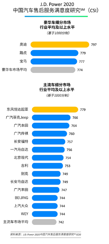根据先前公布的2020中国汽车售后服务满意度研究报告,东风悦达起亚以779的高分荣获主流车细分市场第一。作为全球权威的消费者洞察和市场研究机构,J.D. Power已连续20年主导中国汽车售后服务满意度研究(CSI)。此研究基于购车13到48个月内车主的售后服务体验,是业内公认的衡量车企售后服务满意度的标杆。2020年的研究报告覆盖全国70个城市的32,702名车主,涉及50个品牌,从6大维度客观体现消费者对售后服务的满意程度。