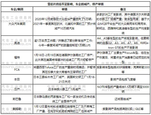 继2020年12月南北大众被爆出芯片短缺而减产的消息后,汽车行业芯片短缺问题持续蔓延,已经在全球范围内导致至少10家国际车企减产,甚至停产,包括大众集团、福特汽车、丰田汽车、FCA等。
