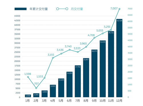 至此,2020年全年,蔚来累计交付43,728台,同比上涨112.6%,自2018年6月至今共交付75,641台。进入2021年,蔚来1月份共交付新车7225辆,同比增长352.1%,连续第六个月创品牌单月交付数新高。