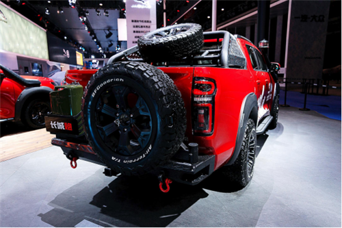 后斗设计了多用途自定义侧板置物架和滑动载重置物托盘,龙门架上可以安装各种型号的车顶帐篷,轮毂使用全球著名的雅泛迪轮毂搭配百路驰享有盛誉的KM3轮胎,适应更艰险的户外路况。长城炮越野皮卡穿越版最大的亮点是将各种装备固定,配备车顶行李架、车顶射灯、车头射灯等,便于恶劣路况的穿越、同时更换轮胎、轮毂,看起来更霸气。