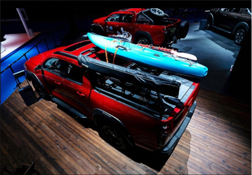 野钓炮将货箱改装为滑轮抽屉式隔断储物仓,可将渔具和鱼获分类放置,告别鱼线缠绕和泥水横流;全覆盖式龙门架,设置大量拓展固定点,分门别类放置鱼竿、铁锹等物品;此外,龙门架的框架一直延伸到车顶,皮划艇等尺寸较大的户外装备可以通过固定组件安置在龙门架上方。