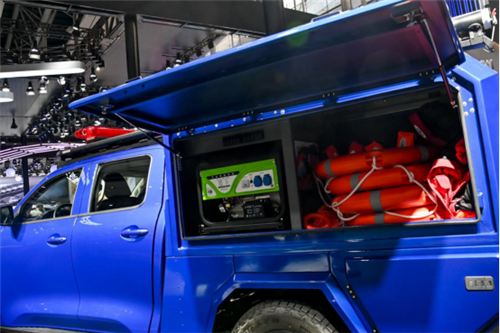 救援炮基于长城炮商用皮卡改装,货箱部分更改为救援移动仓,配备发电机、救生圈、破拆机、医疗箱、担架、氧气罐等专业救援装备;整车配备车载电台、远距离伸缩天线(中继天线)、攀爬梯等救援设备。