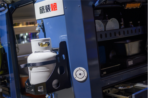 旅装炮采用空间拓展设计,侧方的床位采用斜拉式结构,行车过程中可以将床位升起,收缩到车厢内。车顶采用升降式结构,行车时将车顶降下,降低车身高度,减少风阻;驻车时升起,加强通风和采光,提高舒适性,让用户在旅途过程中可以随时驻营,饱览自然风光。