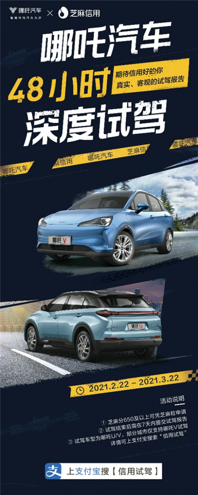 记者通过登录活动界面了解到,本次“信用试驾活动”涉及哪吒汽车14家直营店和54家重点合伙人,覆盖北、上、广、深等全国45个重点城市。2月22日至3月24日,用户芝麻分只要在650及以上,都可以凭借芝麻粒进行申请。具体而言,消费者可在支付宝搜索“信用试驾”,进入哪吒汽车试驾活动界面,仅需用42芝麻粒便可获得一次“48小时深度试驾体验”,之后前往哪吒汽车天猫旗舰店0.01元下单,便可享受深度试驾哪吒汽车(哪吒U/哪吒V)48小时的权益。此外,消费者用28芝麻粒还可享受哪吒汽车上门试驾体验服务,足不出户便可以享受专属的试乘试驾。