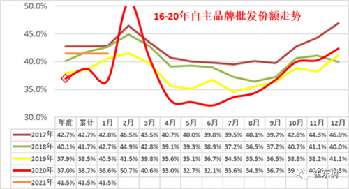 近年来,自主品牌市场份额持续下滑,引发行业极大担忧。乘联会数据显示,自主市占率从2017年的42.7%一路下滑至2020年的37%。此外,自主品牌两级分化趋势也不断加剧。