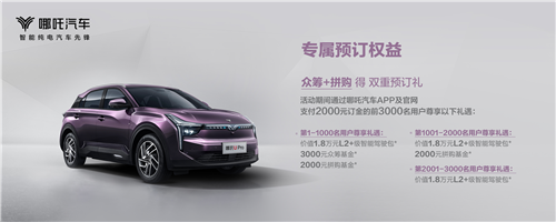 哪吒汽车以众筹和拼购并举的方式,为哪吒U Pro抢先预订的车主准备了多重预订礼,用户可通过哪吒汽车官方网站、哪吒汽车手机APP交付2000元定金,享受丰厚好礼,越早下定,惊喜越多:前1000位下定用户可获得三重丰厚大礼:一重礼,“众筹礼”,3000元众筹基金,支付尾款时,可享受3000元购车款抵扣;二重礼,“拼购礼”,在哪吒汽车APP上参与“爱拼才会赢”活动,邀请好友参与拼积分,获得最高20000积分,可兑换2000元的拼购基金,用于购车尾款支付;三重礼,“智驾礼”,获赠价值1.8万元L2+级智能驾驶包。前1001-2000位的下定用户也可享受至高2000元拼购基金的“拼购礼”和价值1.8万元智能驾驶包的“智驾礼”。2001-3000位的下定用户能享受价值1.8万元的“智驾礼”。