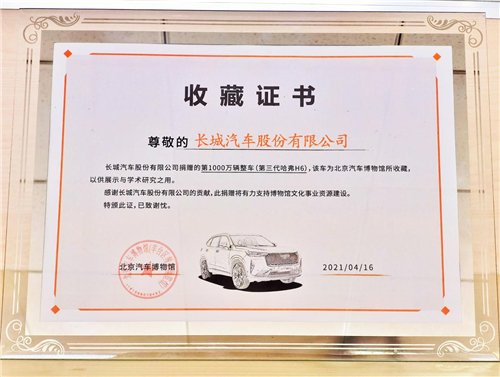 长城汽车第1000万辆整车入藏北京汽车博物馆
