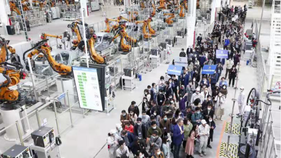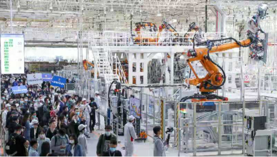 其中,冲压车间采用德国斯特曼全自动高速冲压线,并由日本发那科机器人组成自动装箱系统,实现生产、装箱和运输全自动化;车身车间采用德国库卡设备和技术,自动化率达100%,打造世界最先进的高端智能“黑灯工厂”;涂装车间采用德国杜尔生产线,前处理电泳翻转式输送,干式漆雾分离,涂胶、喷涂100%自动化,全流程智能环保。