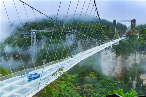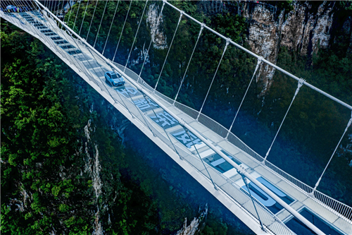 张家界大峡谷玻璃桥,全长536米、桥面距离谷底280余米,是一座大型山谷悬索桥,因创下多项玻璃桥的世界纪录而闻名中外。仅宽6米的玻璃桥,不少人仅仅站在桥头就望而却步,走上透明桥面俯视峡谷更让人感到惊险刺激。