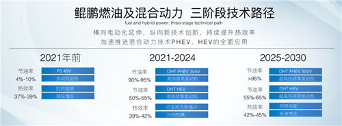 通过三个阶段技术创新,鲲鹏燃油及混合动力的热效率最高可达到45%,节油率超过95%。基于全新混合动力技术的PHEV、HEV也将全面应用,为用户带来更先进、更多样的动力选择。
