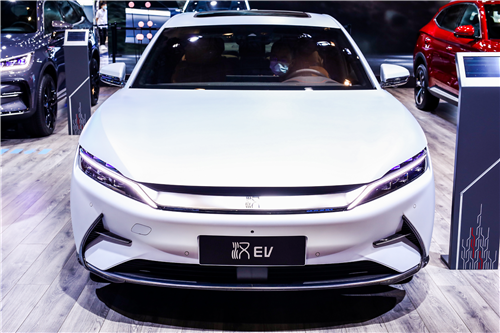展台上的比亚迪汉EV外饰采用的哑光能量白灵感取自德化白瓷,质地坚密,晶莹如玉,釉面滋润似脂,颜色呈现冷调金属质感,充满能量感。在工艺上,这台汉EV采用了特殊“氟金云母”涂层,更加细腻均匀,质感莹润通透,再搭配哑光调清漆,最终实现色彩的丝绸金属变色质感。