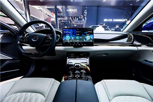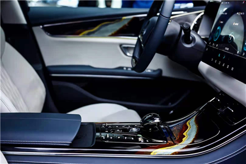 在汉DM展车上,以大漆工艺制造的装饰面板尤为抢眼,这是比亚迪联合广东省传统漆艺工作站联合开发的大漆汽车配饰,更是践行中华优秀传统文化创新性发展的一次新探索。比亚迪邀请阳江髹漆技艺国家级代表性传承人傅以周老师作为顾问,广州美术学院工艺美术学院漆艺专家吴永强老师为汉进行装饰件设计,共同打造了精湛的漆工艺与新能源汽车内饰设计巧妙结合的跨界力作。