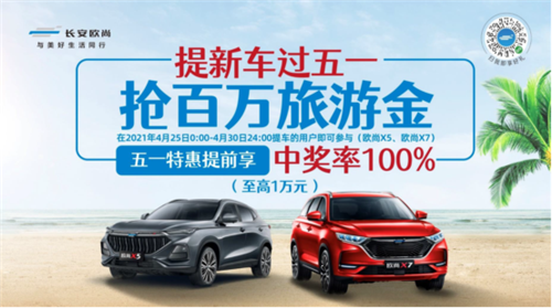 假期将至,长安欧尚也为大家带来福利。4月25日0:00—4月30日24:00,在欧尚styleAPP成功下订欧尚X5、欧尚X7两款车型,并在此时间段内提车的用户,即可参与“百万旅游金”抽奖,现金奖金至高1万元,中奖率100%。