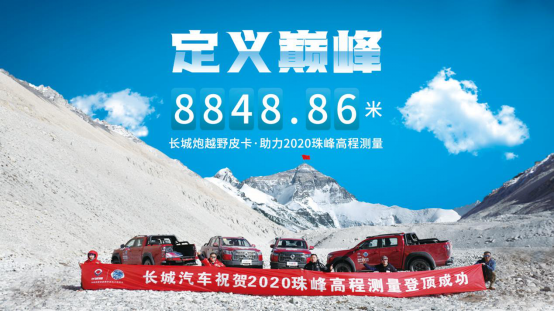 2020珠峰高程测量任务中,登山队员们前后三次向珠峰冲击,最终于5月27日11点成功登顶,让五星红旗闪耀地球之颠。2020年12月8日,2020珠峰高程测量公布结果——8848.86米。长城炮越野皮卡作为官方媒体工作用车,全程协助珠峰测高工作,与孙斌共同见证了这一伟大历史时刻的诞生。