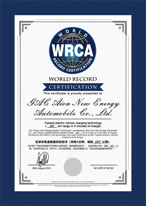 8月30日,广汽埃安举行线上发布会,正式对外发布了能够实现“充电5分钟,续航200公里”的超倍速电池技术和全球充电功率最高的A480超充桩。同天举行的,还有“全球最快充电速度世界记录挑战”全网直播。来自SPEED++车队,搭载了超倍速电池技术的AION神秘挑战车成功实现“充电5分钟,行驶207公里”的成绩,并获得了世界纪录认证机构(WRCA)的权威认证。来自全国的顶级专家、主流媒体以及网友,共同见证了“纯电动车充电速度最快世界纪录”的诞生。