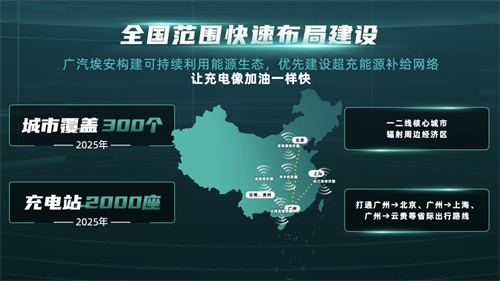 接下来,广汽埃安还将在全国范围快速布局建设品牌超充站,让新能源车充电体验与燃油车加油划上等号,为用户带来极致的充电体验。预计到2025年,将会在全国300个城市建设2000座超充站,渗透至地级市,实现全覆盖。