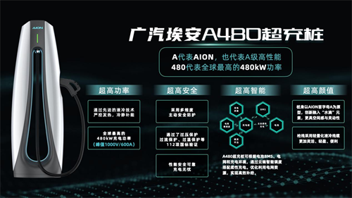 “A”即是AION的首字母,也代表A级高性能,而“480”则代表全球最高的480kW功率。该超充桩具备超高功率、超高安全、超高智能、超高颜值等四大特点,其拥有全球最高的480kW充电功率,峰值功率可达1000V,电流600A,并采用液冷式充电系统和AION专属科幻水滴造型设计,可通过云端智能调度匹配柔性充电,便于快速推广普及。
