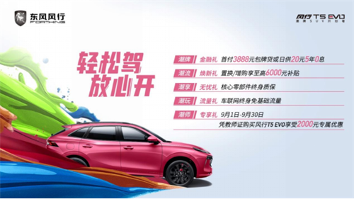 作为一款刚刚上市的新车,风行T5 EVO能与长安CS75 PLUS、博越PRO等自主SUV大佬一同进入消费者的选择圈,凭借的是“用自主品牌的价格,提供30万级合资和豪车性能和品质”的初心。通过上述对比,我们不难看出风行T5 EVO的诚意。值得注意的是,风行T5 EVO更在金九银十的购车旺季为用户推出钜惠购车政策,包括潮牌金融礼:首付3888元包牌贷或日供20元5年0息;潮流焕新礼:置换/增购享至高6000元补贴;潮享无忧礼:核心零部件终身质保;潮玩流量礼:车联网终身免基础流量;潮师专享礼:9月1日-9月30日,凭教师证购买风行T5 EVO可享受2000元专属优惠。5重优惠,诚意满满,是时候下手了!