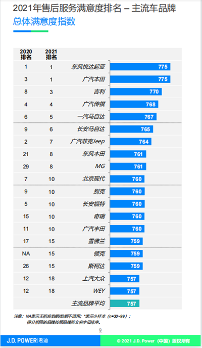 近日,J.D.Power 2021年中国售后满意度指数 (CSI) 研究结果正式发布,根据调查及数据分析研究显示,MG以761分的售后服务满意度指数,在自主品牌中位列第3,在主流车品牌中排名第8,充分体现了MG在售后服务方面优良的品质与口碑。