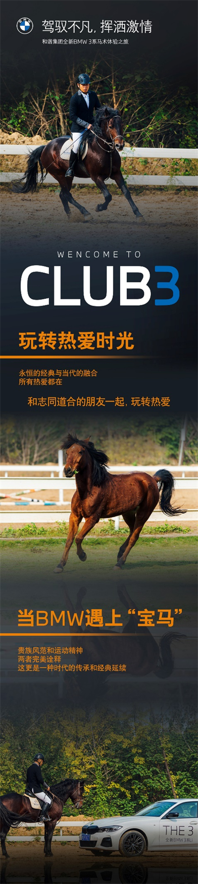 随着时代的多元发展,BMW3系的优良基因不断进化,以前卫科技及先锋豪华塑造时代标签,吸引了众多具有相同特质的年轻人,而CLUB 3作为粉丝聚集地,这一次让我们一起在马术俱乐部找到志同道合的伙伴,忠于内心,追随所爱。