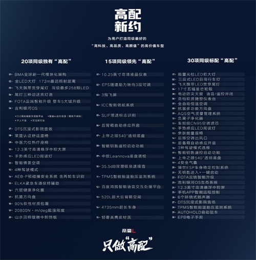 11月21日,吉利汽车公布帝豪家族旗下高端轿车帝豪L核心配置信息,并透露该车将只做“高配“,主打“高科技、高品质、高颜值”于一体的高价值车型。据悉,帝豪L是一款基于BMA架构打造的全新顶流之作,具备20项同级独有“高配”、15项同级领先“高配”、30项同级标配“高配”的市场同级领先价值。