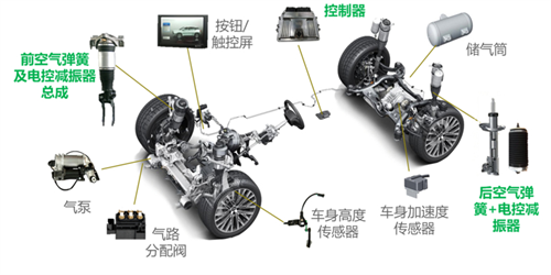据了解,乘用车空气悬架系统结构复杂,主要由空气弹簧、ECU控制器、空气供给单元(具体包含空气压缩机、分配阀等)、储气罐、减振器、以及传感器(包括车身高度传感器、加速度传感器)等部件组成,部分零部件需进行耗资大耗时长的车型适配性开发,具较高技术门槛。