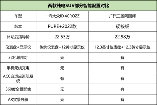 很多纯电车型都会通过智能配置的搭载,让消费者的驾乘品质得到提升。为了公平对比,本次选取了同是补贴后售价在22万左右的车型版本:一汽大众ID.4 CROZZ PURE+2022款(补贴后官方售价22.53万)和广汽三菱阿图柯硬核版(补贴后官方售价22.98万)。两者在智能配置方面,都表现出都市纯电SUV的主流水准。但细致对比下来,售价仅高出4500元的阿图柯硬核版,在科技智能配备上却比ID.4 CROZZ PURE+2022款丰富不少。