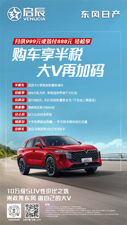 除了根据年轻人的特性去定制产品和服务,东风日产启辰积极响应近期国家购置税减半的政策,为消费者制定了“全系享半税,大V再加码”优惠,以加码补贴,让用户购车无忧。购买东风日产启辰全系车型,可享888元包牌贷福利;购买东风日产启辰大V车型,还可享999元低月供、增换购至高补贴6000元、动力总成终身质保、十年免费基础流量、到店试驾尝鲜礼等加码福利。