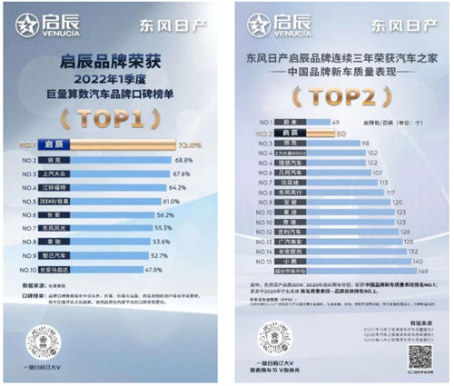 省油好开还耐用,好口碑也持续霸榜。得益于雷诺-日产-三菱联盟雄厚的技术支撑,东风日产启辰共享东风日产研发、制造等全价值链体系资源,沿袭世界领先的造车标准,旗下车型以优异的品质多次获得市场认可。在近日由巨量算数公布的《2022年1季度汽车品牌口碑榜单TOP20》中,启辰以72.0%的正面评论占比,排名榜单首位,再次证明启辰大V等车型的可靠品质。除此之外,在今年3月15日发布的2021年度《汽车之家乘用车新车质量报告》中,东风日产启辰排名中国品牌新车质量表现TOP 2。值得一提的是,这是继2019年、2020年连续获得《汽车之家乘用车新车质量报告》中国品牌新车质量表现排名NO.1后,启辰连续三年位居质量表现榜前两名。