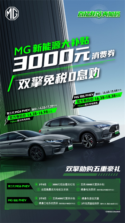 “国家队”MG再度出手,在国家减征燃油车购置税600亿元、MG燃油车补贴再加码的基础上,对旗下插电混动车型,推出3000元新能源消费券的优惠政策。这一举措不仅是对国家长期发展新能源汽车政策的有力回应,更奋楫扬帆助力中国经济乘风破浪。