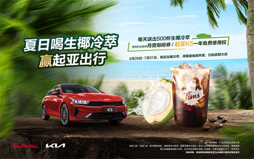 当汽车遇上咖啡,将会擦出怎样的火花?6月28日,起亚宣布携手全球知名咖啡连锁品牌Tims推出“与起亚K5一「起」追夏日「椰」”的主题活动,通过与Tims咖啡进行联合跨界活动,扩大用户品牌体验触点。