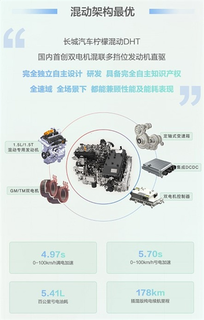 长城汽车柠檬混动DHT是双电机混联多挡位发动机直驱技术,以双电机混联拓扑结构为基础,打造了一套高效能、高性能混合动力解决方案,并拥有HEV/PHEV 两种动力形式,“1.5L +DHT115”、“1.5T +DHT130”以及“1.5T +DHT130+P4”三套动力总成。其“七合一”高效能多模混动总成,采用高度集成化设计,体积更小,重量更轻,传动效率更高,NVH性能更好,可靠性更好;双电机混联拓扑结构可控制系统智能切换行车模式,实现全速域、全场景下高效能与高性能的有效平衡;柠檬混动DHT成就了客户动力、经济性、续航、舒适性多维度的高价值体验。