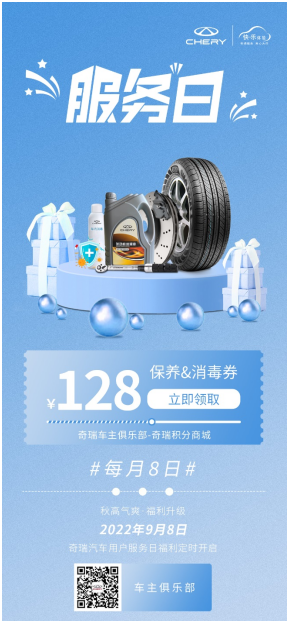 2022年9月8日当天,奇瑞用户可通过“奇瑞车主俱乐部”微信公众号/小程序,在“我的福利-积分商城”中参与0.1积分抢“9月128元保养消毒券”。友情提示,平台限量发售3000张,即时抢购,全拼手速!
