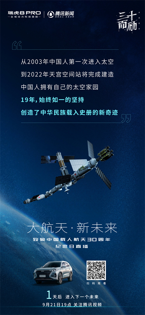 2022年,是中国载人航天工程30周年,更是中国载人航天工程里程碑式的”航天年“。从“神舟”问天、“嫦娥”揽月,到“北斗”指路、“祝融”探火,再遥想“羲和”逐日、“天和”遨游星辰……30年来,中国航天用实际行动把梦想照进现实,谱写出中华民族飞天梦想的崭新篇章。近日,为庆祝中国载人航天工程30周年,由腾讯新闻举办的“三十而励 何惧探索”2022航天直播即将于9月21日开启。而以技术立企的奇瑞汽车也将携手腾讯新闻共同致敬中国载人航天工程30周年,并携”苍穹探索使者“—瑞虎8 PRO点亮此次直播活动,为中国航天事业喝彩。