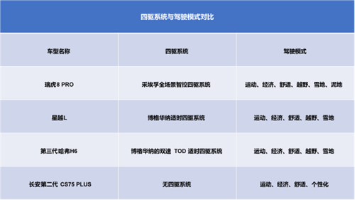 四驱系统是车辆越野性能的一大保障,这四款车型中,瑞虎8 PRO、星越L与第三代哈弗H6搭载的都是适时四驱系统,可提供运动、经济、舒适、越野、雪地五种驾驶模式,而瑞虎8 PRO在这五种驾驶模式的基础上,独家匹配了泥地驾驶模式,足可应付野外泥泞多变的复杂路况,雨雪等恶劣天气下出行也不必担心,其所具备的越野能力使得爬坡过坎不成问题;相比之下,长安第二代CS75 PLUS没有搭载四驱系统,若是遭遇泥泞湿滑路段,车轮极易发生打滑现象,对热爱冬季野钓的朋友们来说,车辆在冰面上穿行时危险系数大大增加,同时由于缺乏越野能力,在艰难路况下,其通过性恐怕会逊色不少。