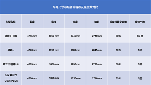 在钓鱼迷圈子里流行这样一句话:“钓鱼迷永不空军”,不论是鲫鱼、鲤鱼,还是鲇鱼、鲈鱼,对钓友们来说,鱼护里必须有些活物,绝不能空手而归。如此一来,后备箱得足够能装,如果空间灵活的话,最好既能满足一人独钓的出行需求,也能提供钓友同行的欢乐体验。综合车身空间尺寸与后备箱容积表现来看,瑞虎8 PRO的后备箱装载能力最为突出,后排座椅放倒后,可扩容至1930L,堪比一大储藏间,可轻松放下28英寸、24英寸、20英寸三个行李箱。此外,兼具5+2的灵活空间设计,根据多功能多场景的家用需求,可选5座与7座车型,相比之下,其他四款车型均为5座设计,车内空间的灵活度不高。