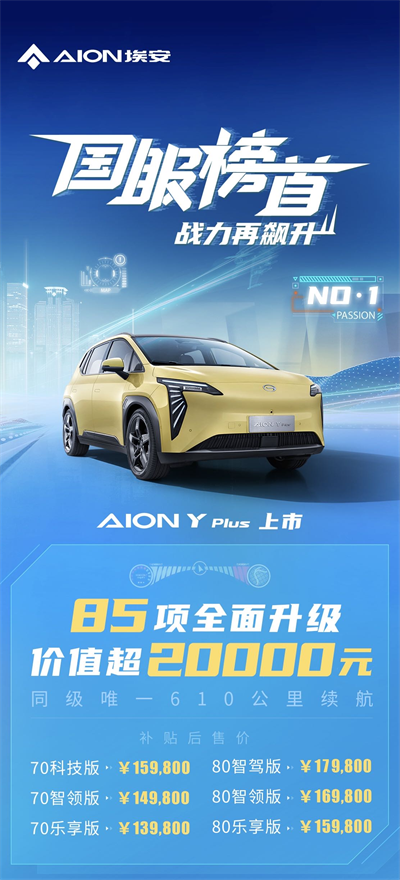 9月27日,AION Y Plus通过埃安自制脱口秀厂牌《国服榜首脱口秀》正式上市,AION Y Plus也在这场前所未有的SHOW中登场,共推出510km、610km两个续航版本共计6款车型,补贴后的官方指导价为13.98万元-17.98万元,10月即开始交付。当前已通过埃安APP订购现款且未排产的AION Y客户,可选择转订AION Y Plus,体验最新升级。