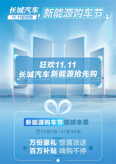 ● 11月1日-30日,长城汽车新能源购车节-11.11狂欢购重磅来袭,百万补贴送不停、万套豪礼大发送、爆款车型限量抢购、苹果手机惊喜抽奖、万元购车券限量抽取。