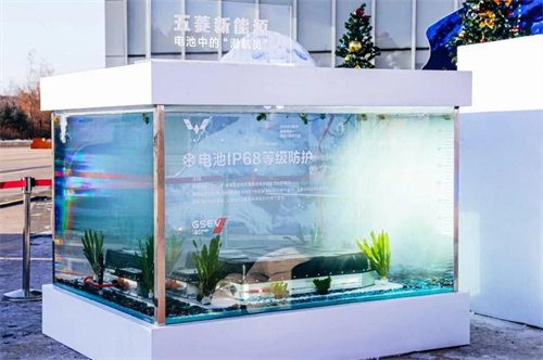 在电池包水中全浸泡挑战中,五菱GSEV标准化电池包全程无进水、无漏液,并成功点亮圣诞树上灯带,正常对外放电。