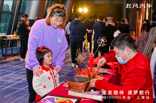年会当天,R7车主携手组成车队自驾巡游上海,在欣赏城市风光的同时,深度驾驶和体验了“智舱屏霸”飞凡R7,为飞凡汽车的首届车友年会“星友陪伴,逐梦前行”拉开了序幕。在世贸洲际深坑酒店的年会现场,车主们齐聚一堂,畅谈与回顾了过去一年飞凡车友会活动的精彩瞬间。此外,车主们体验了捏糖人、写春联等传统年俗互动环节,为这场春节前的聚会增添了浓浓的年味。