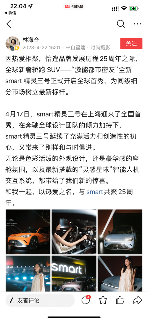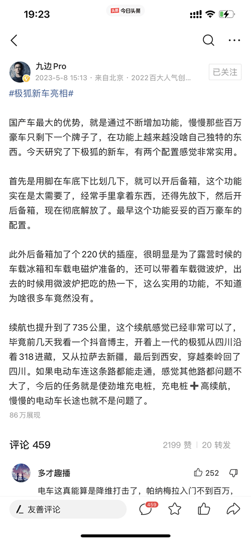 作为国内一流的通用资讯平台,今日头条一直以来都以内容丰富、观点硬核的形象示人,在海量用户的加持下,今日头条所拥有的流量资源对合作对象而言就是巨大的红利。2023年上海国际车展让我们看到了今日头条的资源整合能力和资讯传递能力,大V们的深度参与让上海车展的参展方、主办方与观众们都收获颇丰,尤其是本次车展上的“跨界”营销,也必然会为车企们带来新的发展与经营思路。