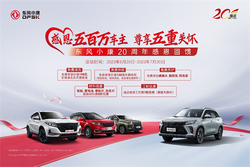 2023年是东风小康公司成立20周年,旗下东风小康及风光品牌汽车市场保有量目前已突破500万辆。为感恩500万车主朋友的肯定与支持,东风小康公司面向全体新老用户推出“感恩五百万车主 尊享五重关怀”回馈活动,自2023年6月20日起至7月30日,所有车主均可尊享五重礼遇,包括爱车免费清洗、免费体检、免费养护、材料优惠、工时优惠等丰富内容。