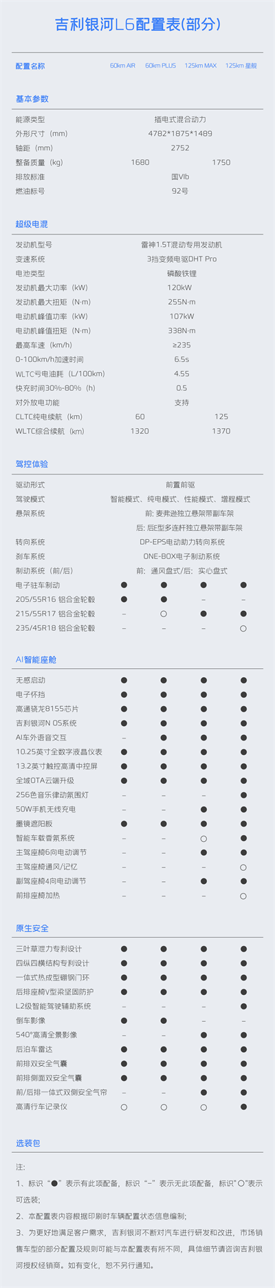 8月18日,新一代全能电混家轿—吉利银河L6公布部分版型详细配置信息。从此次曝光的配置表来看,吉利银河L6推出60km和125km两种纯电续航,AIR、PLUS、MAX及星舰共4个版型。整车价值感、品质感、科技感、体验感全线拉满,不管是新一代雷神电混 8848、神盾电池安全系统、银河N OS智能车载系统等高端先进技术,还是吉利全栈自研的全场景AI智能大模型、13.2+10.25英寸双大屏、全域OTA、感应解锁无感启动等前沿先锋科技,均全系标配,全方位给到用户满满诚意。
