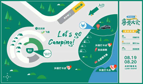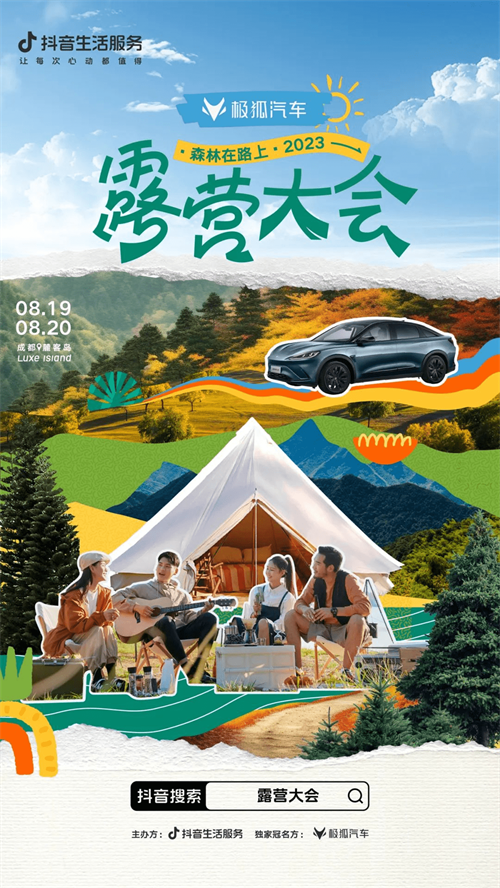 8月19日至8月20日,抖音生活服务在宝藏露营地麓客岛,正式推出“露营大会·森林在路上”主题活动,打造了首个露营场景深度体验营销项目。「露营大会」以满足用户露营需求为出发点,通过露营市集、音乐live、户外运动多种形式,深度打造线下场景,同时融入品牌营销需求,携手汽车品牌商家,将露营调性与新车理念相结合,助力品牌实现新品营销的创新探索。