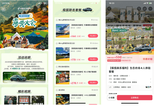 本次活动中,抖音生活服务也助力品牌大玩跨界营销,联动全国30+热门优质露营地,如武汉金银湖半岛庄园嗨KING营地、北京丰台嗨KING营地、上海影视乐园嗨KING营地、Star Field·星野露营地等,与极狐汽车共同推出满足夏日露营诉求的联名套餐,打通从种草到转化的闭环链路。