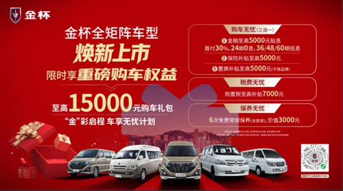 为了让用户轻松拥享新品,金杯还推出了针对金杯海狮王2026款、金杯新快运2026款及金杯海狮2025款车型的“金”彩启程车享无忧计划。该计划包括“金融购车、旧车置换、保险支持”三大核心权益,用户可任选其一,享受更具性价比的购车方案。其中,金融政策首付3成起,可享无息或低息贷款;旧车置换补贴至高5000元;保险补贴至高5000元;此外,购车用户还可叠加享受至高7000元的购置税补贴与价值3000元的免费保养服务。整体价值1.5万元的权益包,让用户从购买到用车全程省心省力,开启高效创富之旅。